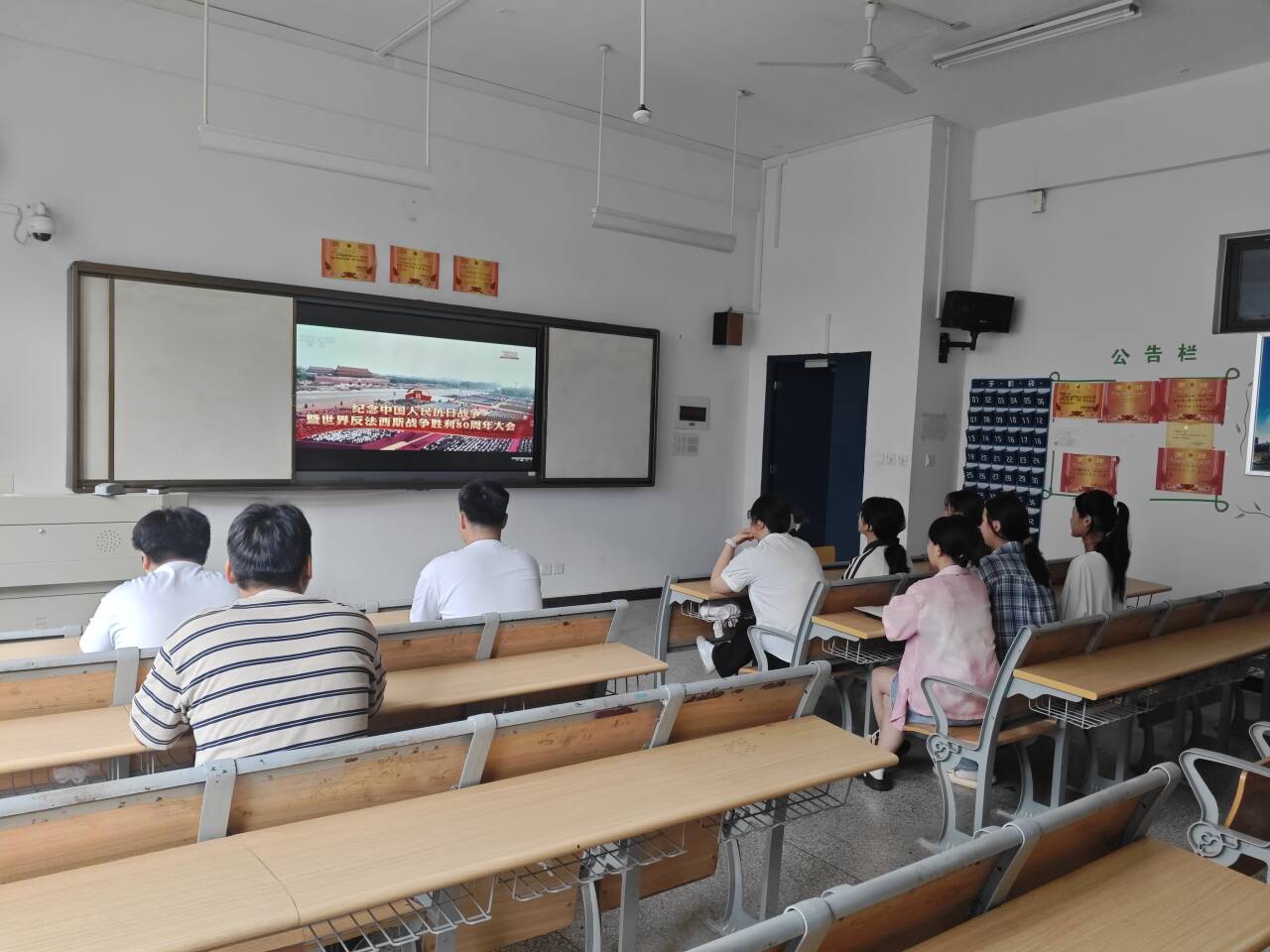 9月3日上午9时,纪念中国人民抗日战争暨世界反法西斯战争胜利80周年大会在北京天安门广场隆重举行。中共中央总书记、国家主席、中央军委主席习近平发表重要讲话并检阅部队。全校师生怀着激动和崇敬的心情,通过多种方式认真收听收看直播,共同上了一堂生动的爱国主义教育和国防教育课。